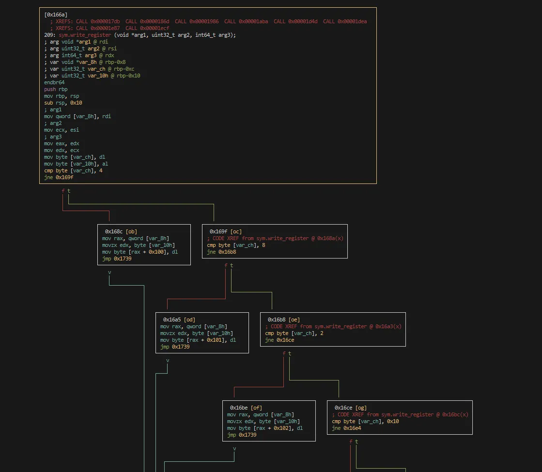 The control flow graph , where is a set of nodes (in our case, we have one node per basic block) and is a set of edges, where an edge is present if there is a jump between two basic blocks. Here is an example of CFG extracted with Radare2: