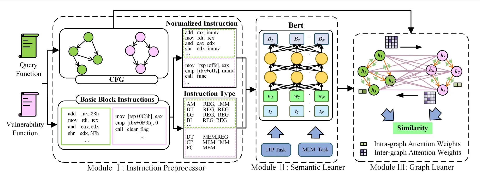 Here we leverage the structure of the ACFG and we have a dual level attention mechanism that extracts information within a function (intra-function) and between functions (inter-function). Sounds extremely fancy but it is just message passing known from GNNs, where we use Graph Attention (GAT) but with the distinction that at the inter-function level we exchange information between nodes of different graphs.