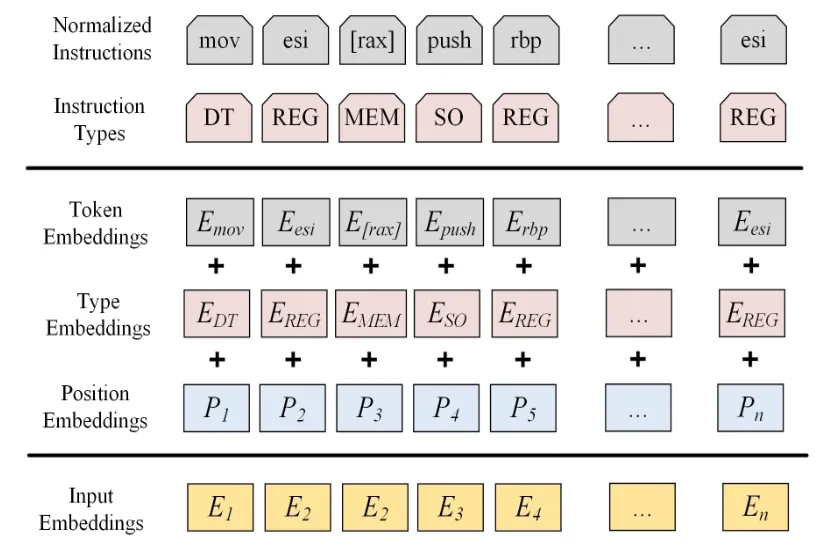 immv for immediate valuesaddr for memory addressesoffs for address offsetsfunc for function namesThere is a distinction between binary code and natural text, as binary code follows a strict format. Binary consists of opcodes and operands, each playing a distinct role. To better capture these roles, we extract Instruction and Opcode Types from each basic block: