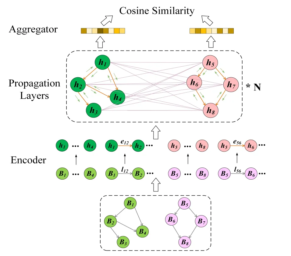 We have our CFG graph that we augmented with node and edge features to obtain the Augmented CFG (ACFG), which is just a triplet with are the initial embeddings for a basic block belonging to . Graph Matching network uses enhanced attention to compare two ACFGs and to derive their embeddings and assess their similarity.