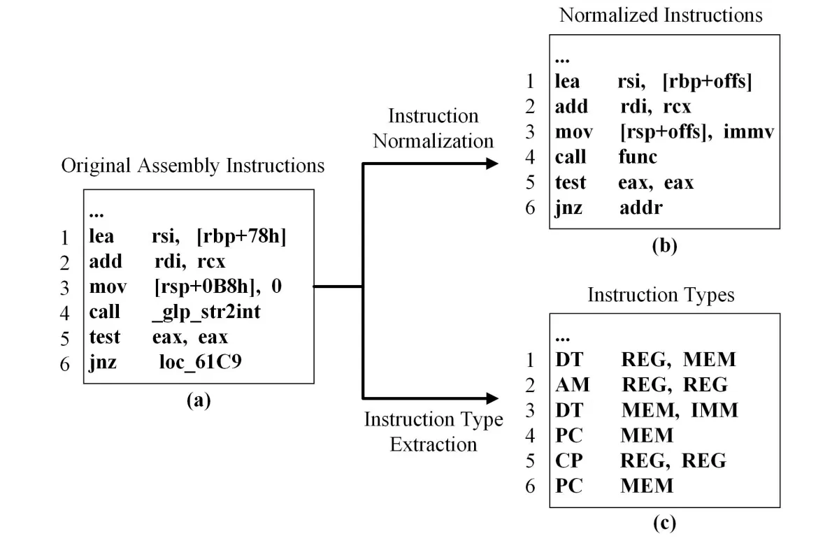 Binary code consists of a vast amount of different instructions, memory addresses, intermediate values, and address offsets. By naively taking these values and embedding them, we would end up with a lot of Out of Vocabulary (OOV) tokens. These are tokens that we have not seen during pretraining but are using during inference. Instruction normalization consists of a few simple rules where we replace tokens with special tokens:
